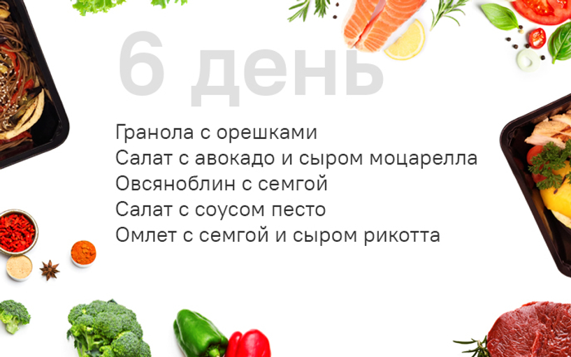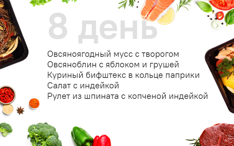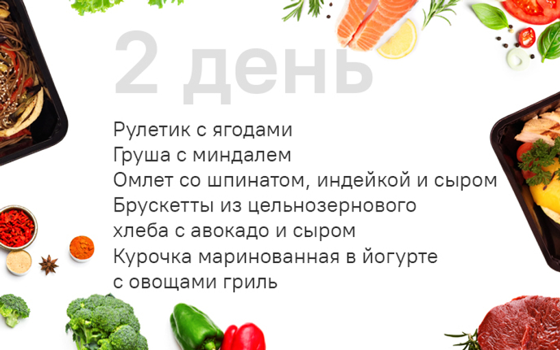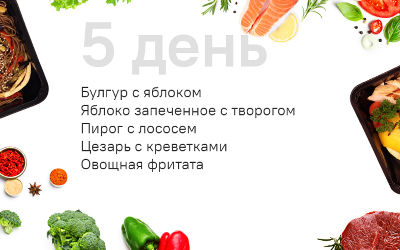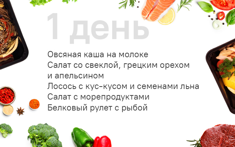 К заказу доступны 5-разовые рационы (завтрак, обед, ужин и 2 перекуса) на 1000, 1300, 1600 и 2000 ккал.
